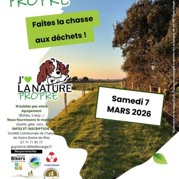 J’aime la nature propre : faites la chasse aux déchets ! SAMEDI 7 MARS 2026 Rendez-vous à 8h30 sur le Parking de la mairie. Organisé par la société de chasse « Saint Hubert » de Notre Dame de Riez Informations et inscriptions au 07 71 71 85 77 / guyrachel.dillet@orange.fr…